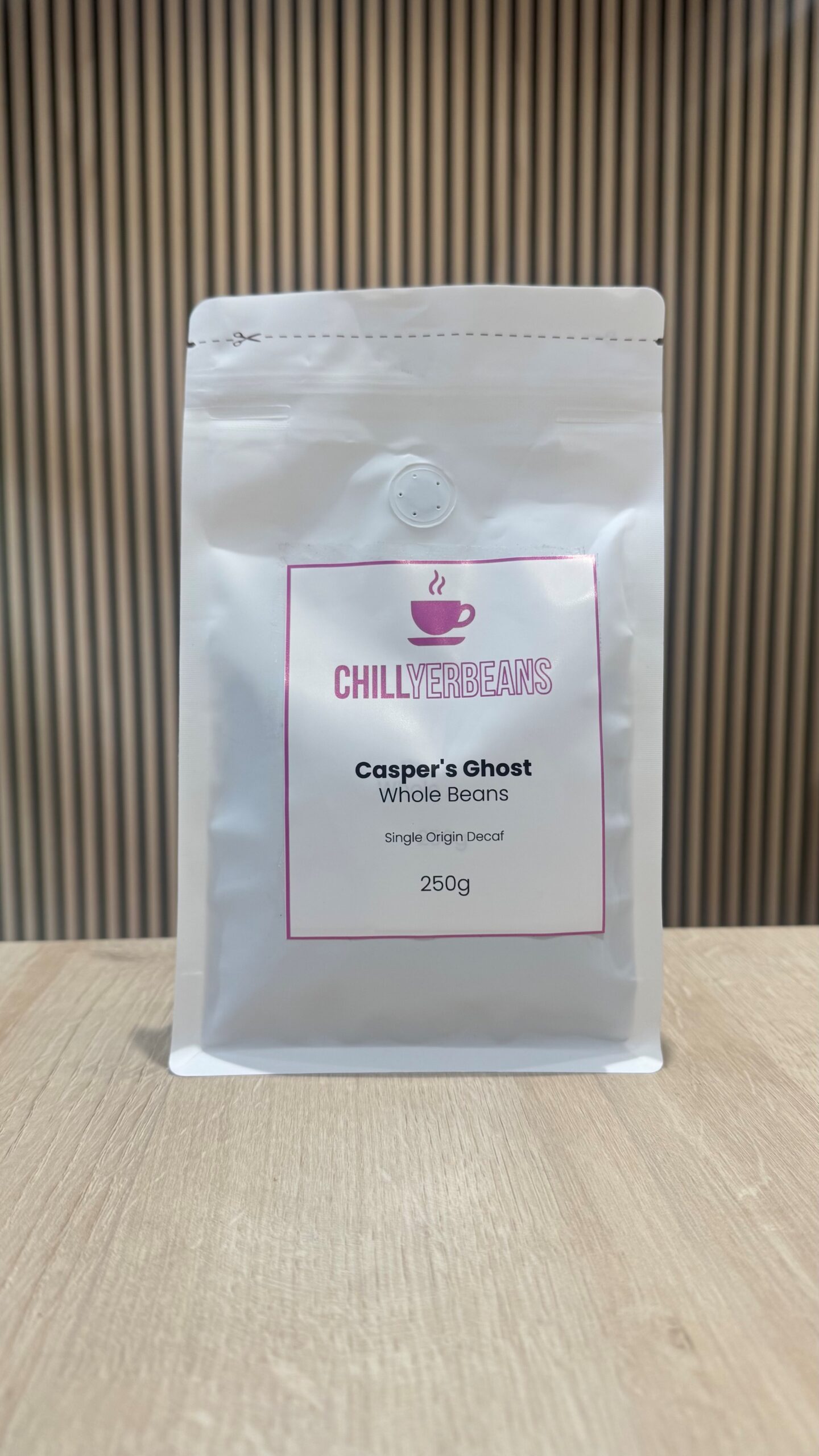 This is Casper’s Ghost – ChillYerbeans’ very own Decaf coffee. Please note – this is the same coffee as Wych D’kta, we just liked both names!